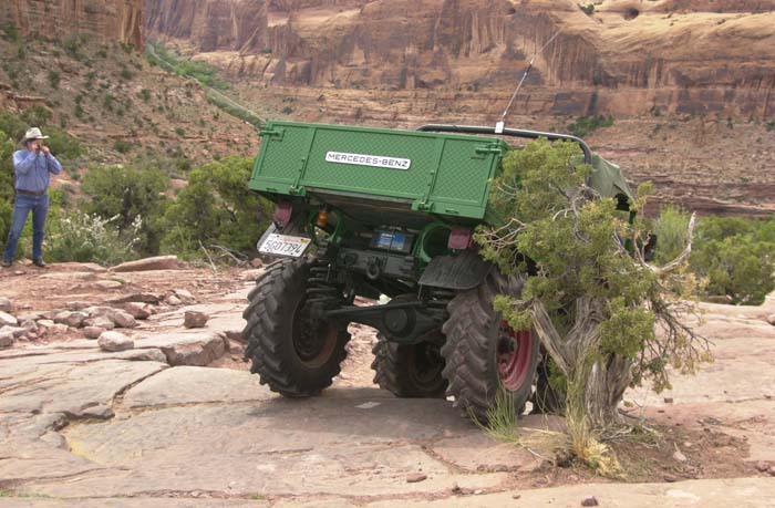 The Moab Rim Trail is one of the most challenging trails in the area. It has some difficult obstacles and the ever-present psychological fry that you are heading up the side of a cliff. Some folks have rolled and if you are unlucky enough to roll near the start of the trail, you go the distance. Rolls further up, while probably not fatal, will be expensive. As you will see in the photos below, you ascend a slab with a away-from-the-cliff cant on the trail.