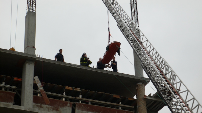When I rounded the corner, I saw that the ladder truck was deployed and noticed that they were lifting a Stokes litter to the top floor of the building.