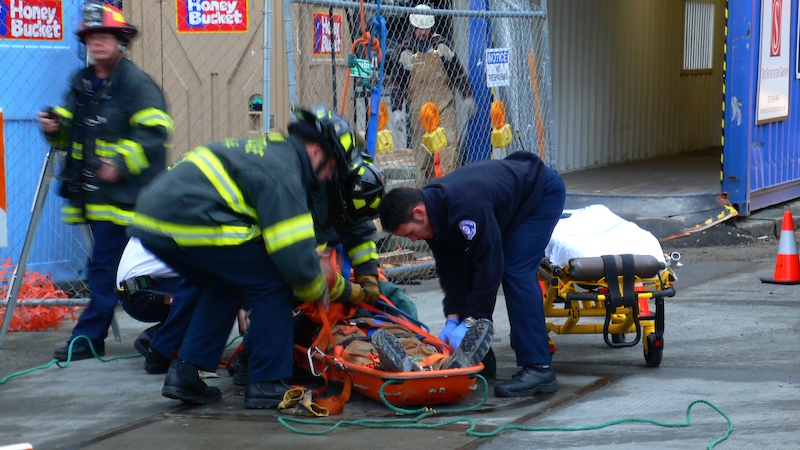 I was in EMS way back when. That is how I put myself through college. Seeing this rescue brought back a flood of memories, most not so savory. I was not able to determine what was wrong with the construction worker or how seriously injured he was. When I was working, my most hated question was "what happened?" followed closely by "is he OK?" and "will he be OK?". I used to spend my down time thinking up 101 smart ass answers for these most stupid questions. But, remembering my reaction to these questions, I did not pester the fire fighters. Probably just as well as they may have given me one of the smart ass answers that they have undobutedly thought about in their downtime.