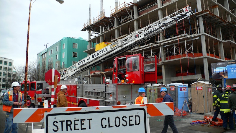 On Monday morning, I was on my way to work, I was confronted with the normal things. A view of the Space Needle and other sights on would associate with the Belltown area of Seattle. But, there was more. The building across the street from my workplace had been under construction for some time. Sadly, one of the construction workers suffered an on-the-job accident that require a rather dramatic rescue operation. I only had my "briefcase" camera, so the photos were not up to normal standards. The photos below are what I saw.