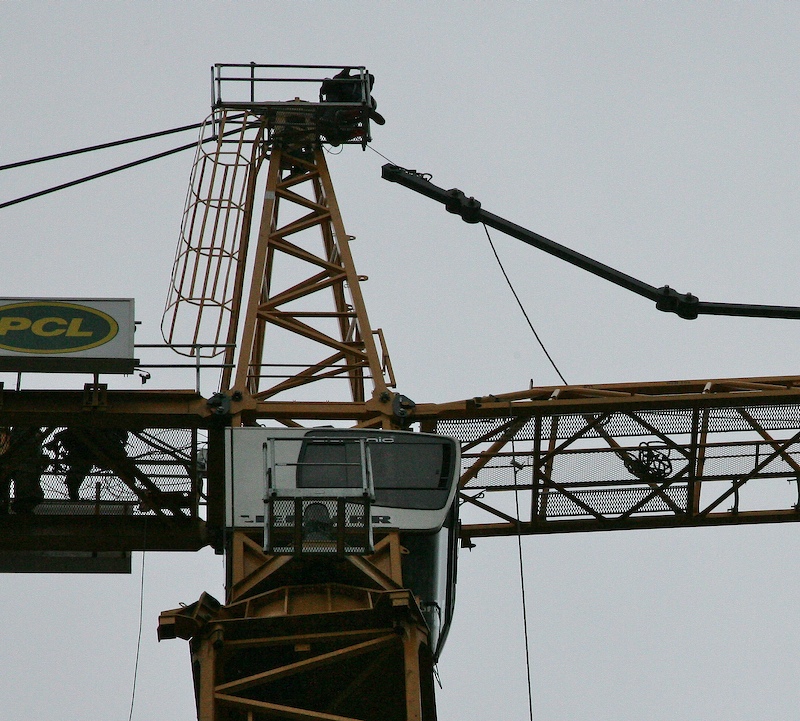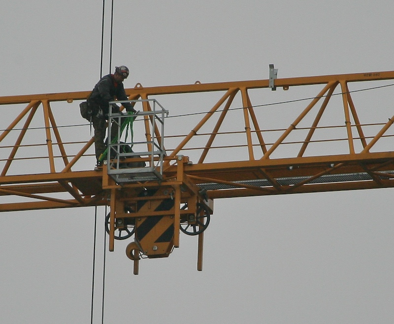 Note the assembler on top of the operator cab. The other one is on the far side of the cab. These guys are extremely exposed. True, they do have a safety line attached, but it is a long, long way down.