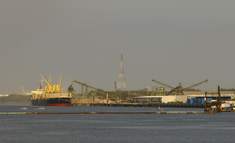 During the night, another cargo ship docked at the facility just down river from the hotel. The ship in the foreground was not there the previous afternoon.