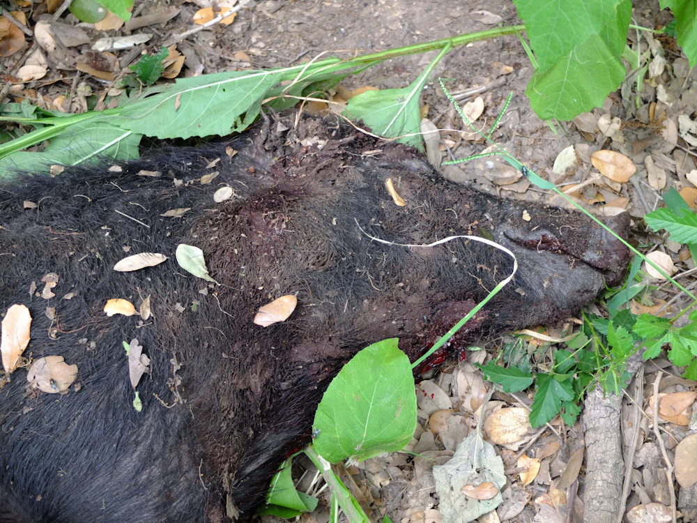 When the hog was pulled from the brush and inspected, we discovered that he had a very hard life indeed. Apparently, this hog got in a fight with another hog and lost big time. Both of his ears had been chewed off and were maggot infested. In addition, his testicles had suffered the same fate.