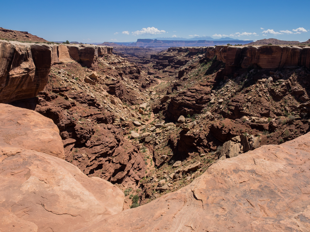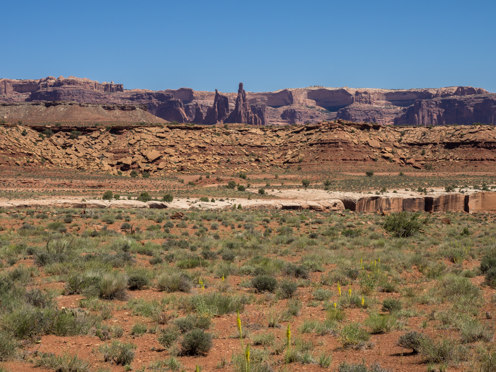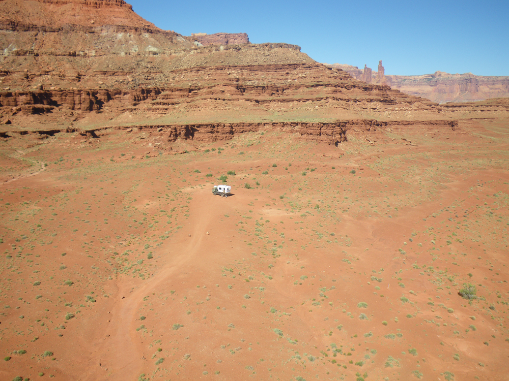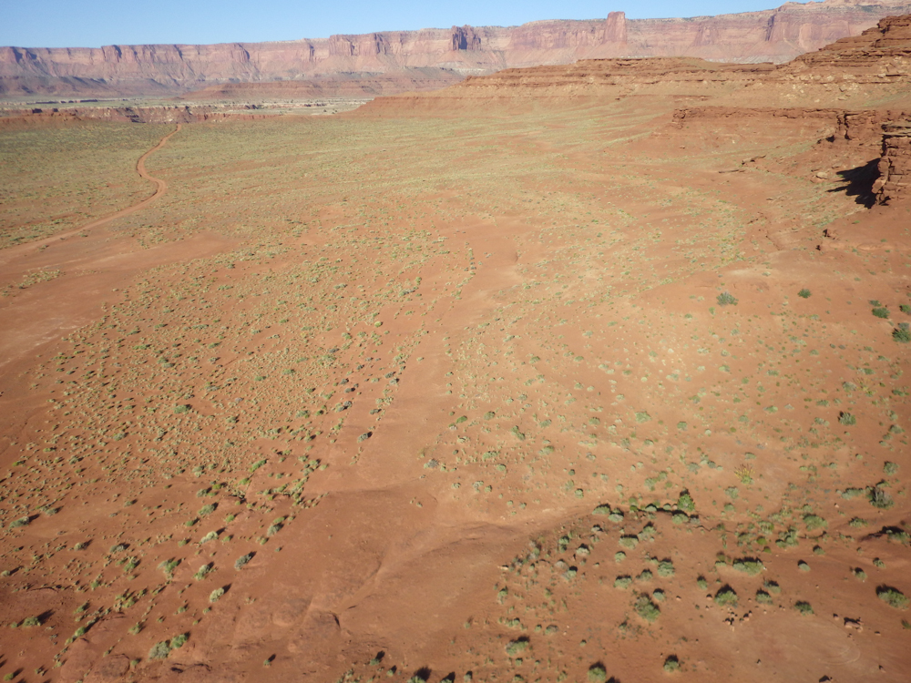 of slickrock and sand. Above, the rim of Canyonlands can be