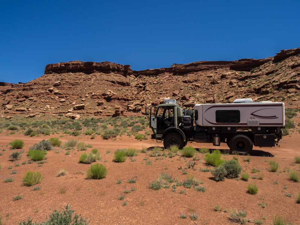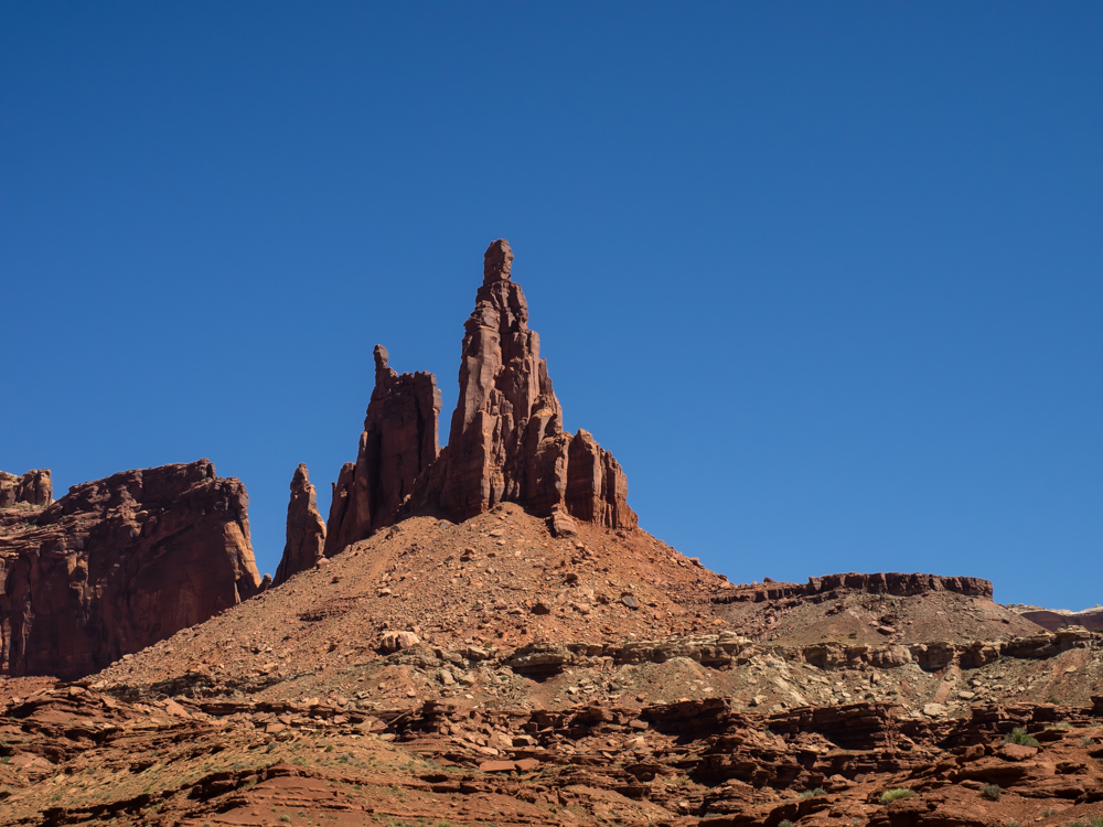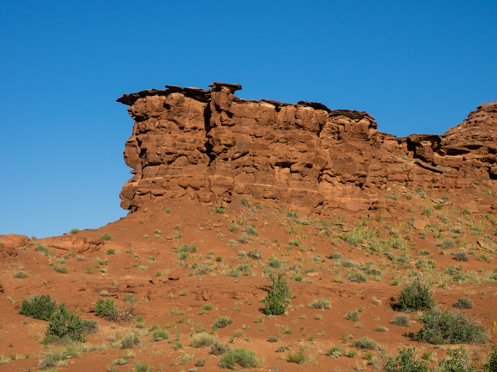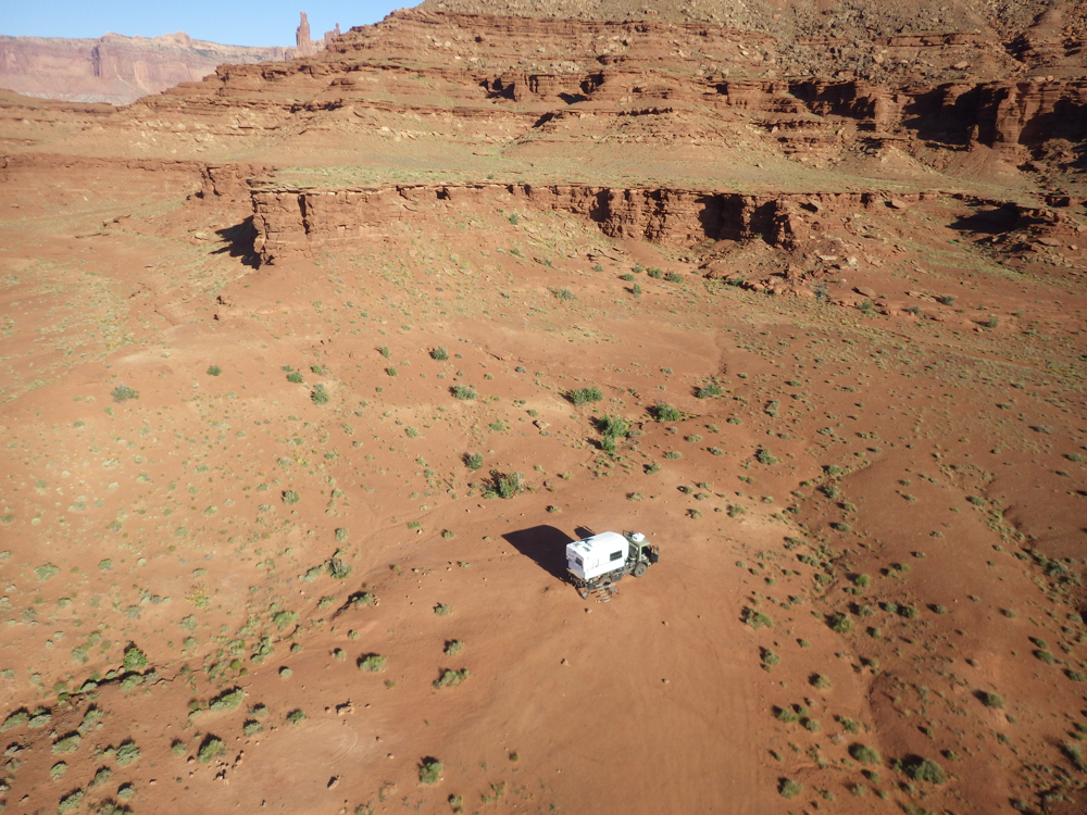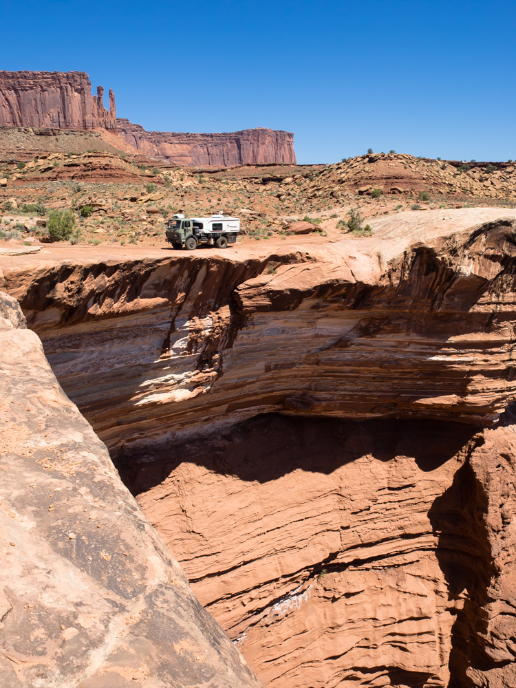 of slickrock and sand. Above, the rim of Canyonlands can be