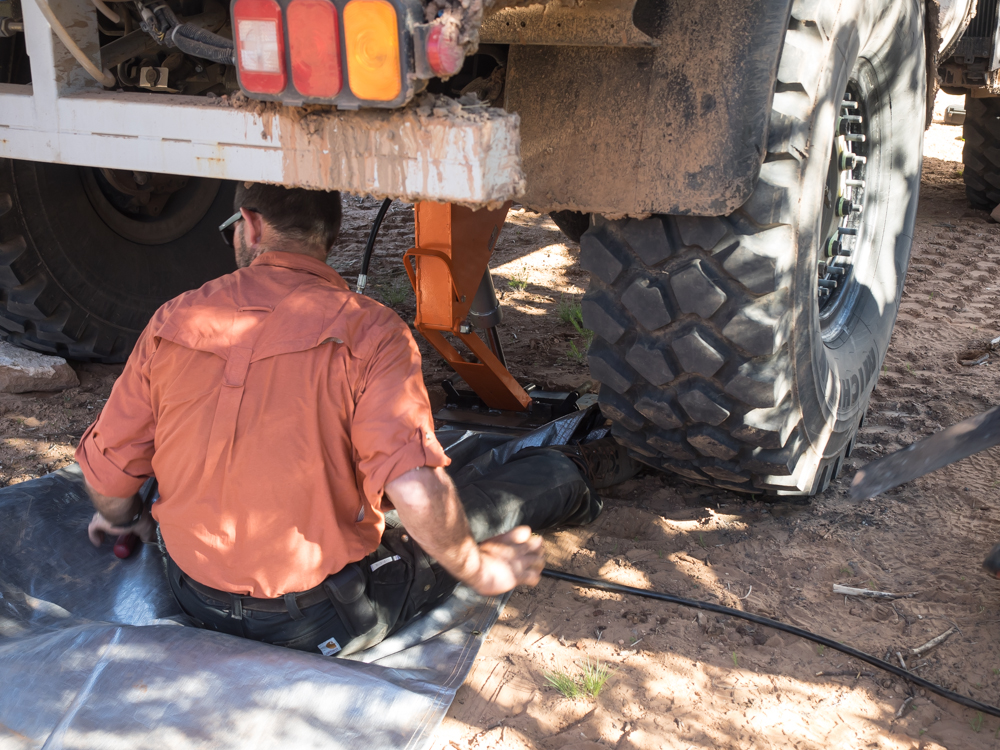 has jacked up his truck to support the removal of the tire.