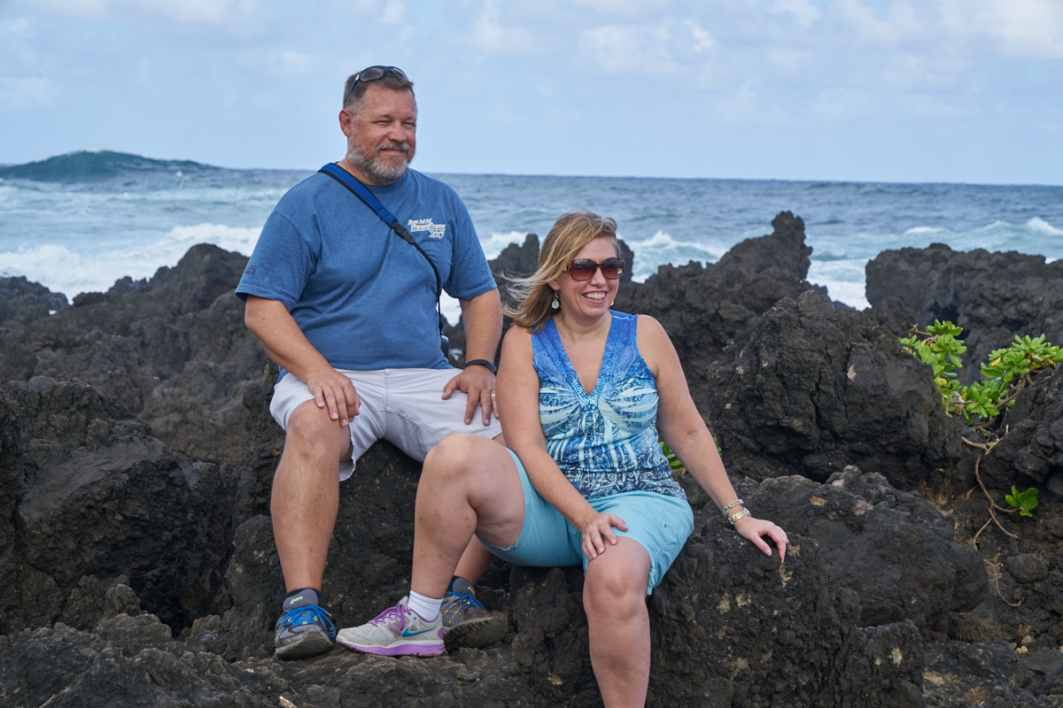 and Stephanie pause for a photo on the jagged lava rocks.