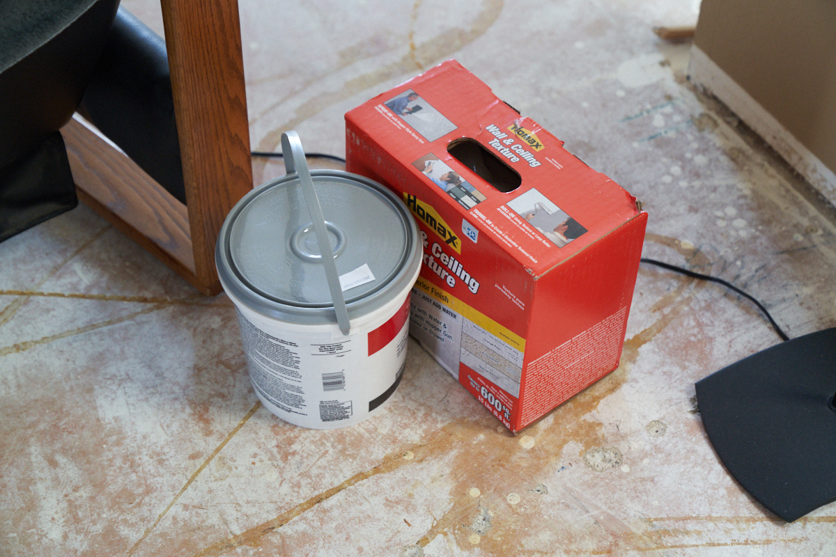 A trip to HD got us concrete patch and spray-on drywall mud.