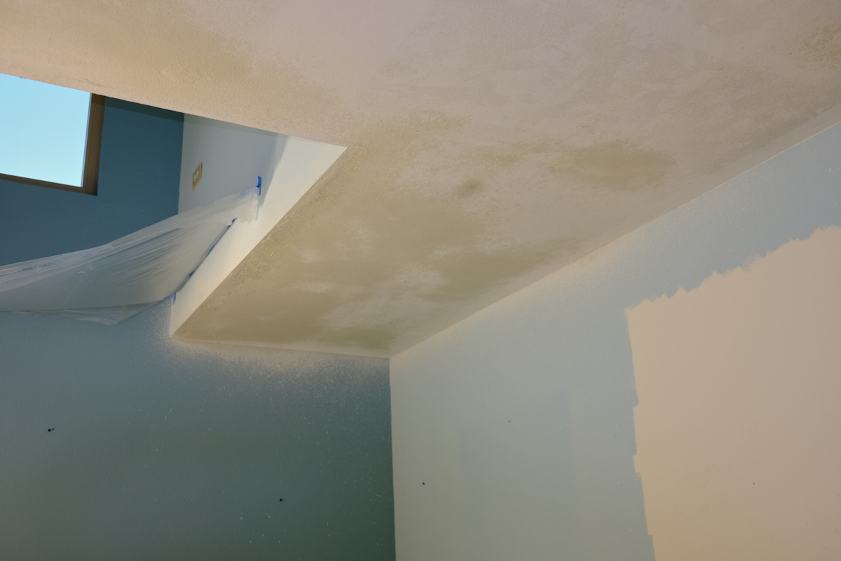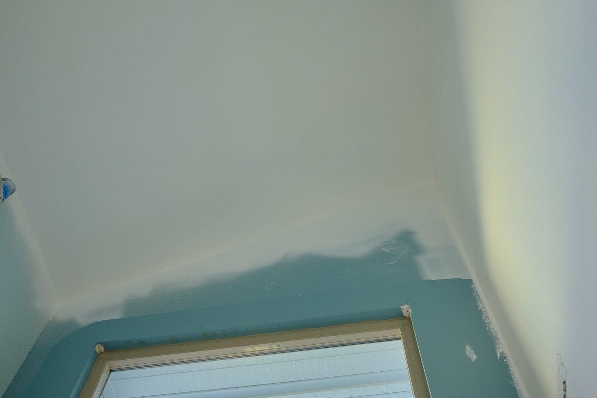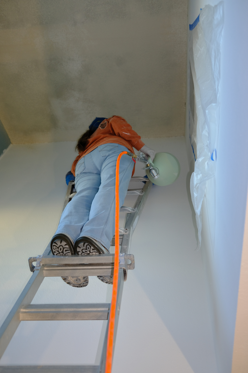 After the new windows were protected with plastic draping, the mud gun was used to apply texture to the ceiling.