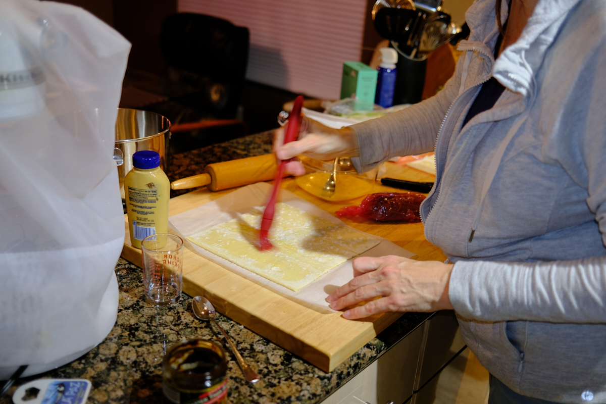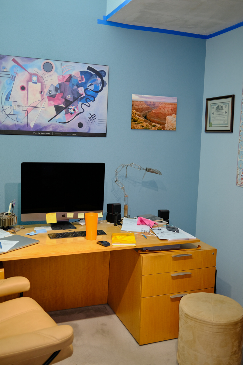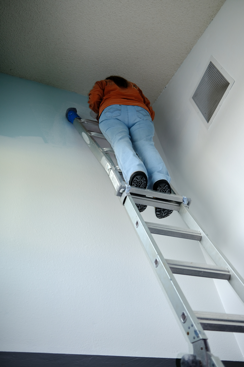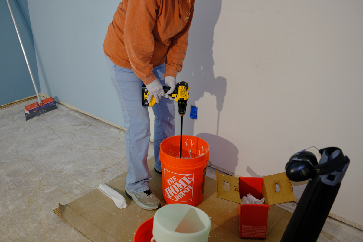 After the new windows were protected with plastic draping, the mud gun was used to apply texture to the ceiling.