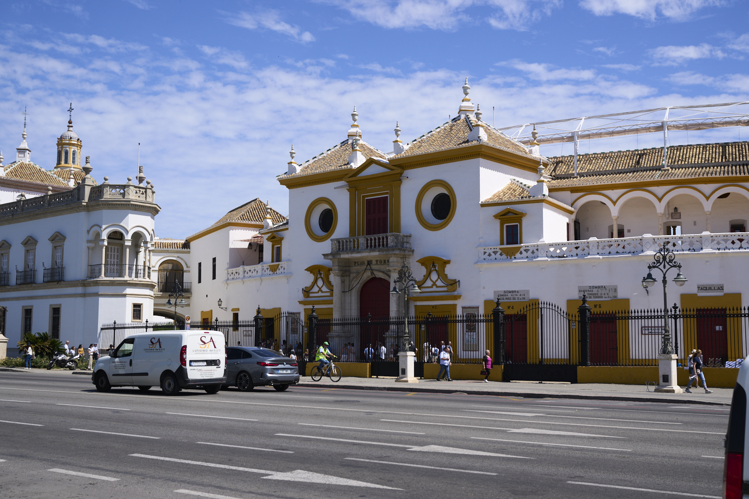 We inverted part of our trip in that we had to taxi from Gibraltar to the border, walk across the border, and then get a taxi to the Algeciras train station. From Algeciras we got the "slow train" to Seville. The trip shot a whole day, but it was reasonably comfortable except for the last, very slow leg. We got into the Santa Justa station and then got a short taxi ride to our hotel near the "center of the action" along the Guadalquivir River at the Triana Bridge. We stayed at the Bequer Hotel, which was very nice. We stayed at this hotel on one of our previous trips to Seville.