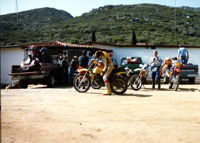 Below, the group saddles up for the first part of the trip to San Felipe. My 3 wheelers are loaded because the dirt trail back to Mex highway 3 is unremarkable and not all that much fun on a 3 wheeler. Plus, we could not keep pace with the bikes. You can see the red tile roof of the hotel office in the left center of the photo as well as the various radio antennas at the facility. The bar and pool room is behind the fellow in the bed of the truck on the right.