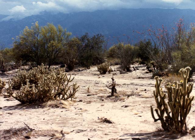 As we headed south toward San Felipe the desert brush got quite thick, remenesent of the Sonoran desert around Tucson. Below, you can see several kinds of cholla, ocatillo, palo verde and mesquite. Also note that there was a storm bearing down on us. The clouds seemed to evaporate at the ridgeline, but it was still a concern.