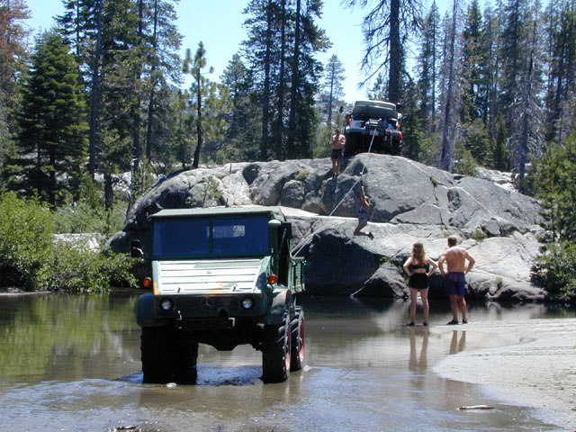 [Back to Index | Previous Photo | Next Photo ]I call this "creative winch tricks". Kai positioned the 416 at the top of this 20' high rock outcropping in the middle of he creek at Rubicon springs. We then connected the winch cable to the 411 which was used as a "deadman". A snatch block was used as a slider and a handle was created from the handle of a hydraulic bottle jack and a rope. The victim ascends the rock, then holding onto the handle, performs the "slide for life" over the pool below. As you can see, Tina Serrano is in mid-stroke. Victims can elect to drop into the pool or slide to a stop in the sand near the rear of the 411. As fate would have it, we did have a near tragedy. As a result of the use of the handle, a burr on the handle sliced through the rope, resulting in Dr. Dan being dropped onto the outcrop. Fortunately, he hit a glancing blow and survived with only abrasions and contusions (brusies and scrapes). Talk about putting a damper on festivities!!