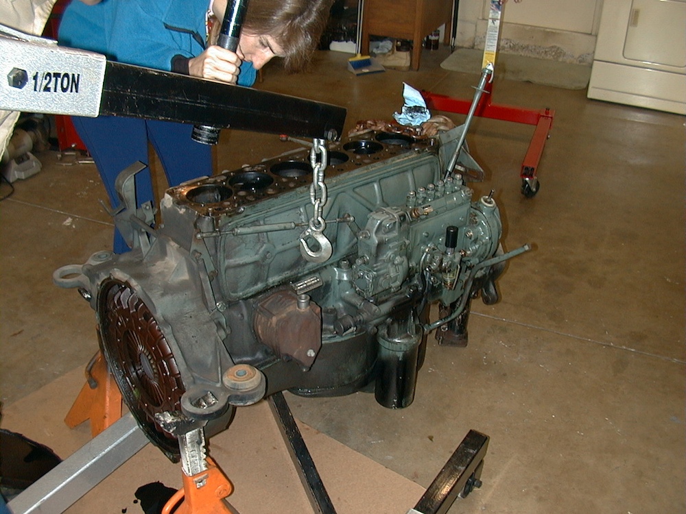 Kai pulled the engine out. Above, Kathleen inspects the inside of the cylinders.