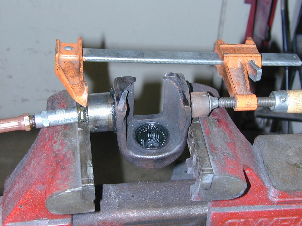 Taking the other side apart. The tool is pulling the bearings on the king pin.
