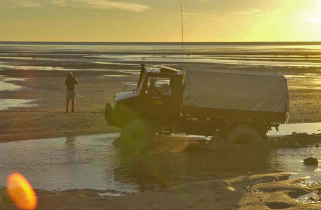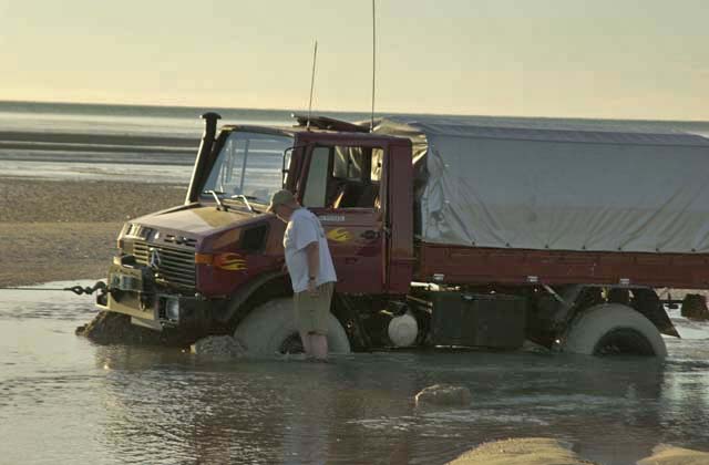 As we progressed down the beach, the tide turned and was starting to come in. We had to cross a small river that was created by an inland estuary that was filled by the high tide. Kai crossed fine. Dan did not. He followed in Kai's tracks, as we had been for hours, but he had perturbed the sand enough to make it fatally unstable. Below, Kai is attempting to pull Dan out. Note the skid wave from the tires being drug through the soft sand.