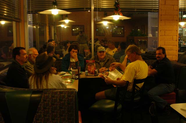 Happily, the trip to Yuma went off without a hitch, but it was slow at 55 mph or less. Yuma is about 150 miles east of San Diego on Interstate 8. There are three 4,000 foot passes to cross to get there and a final big descent into the nearly sea-level desert at Ocotillo. These steep grades make for slow going. And plenty of places to get into trouble, but gladly, it was uneventful. We attempted to stop and a diner that Mark knew, but the place had gone out of business. Instead, we stopped at the Denny's in El Centro. Mostly sufficient food, but somewhat less than the epicurean delights that were planned for dinners on the trail. Below, the team is preparing to indulge in Denny's best (which isn't that good).