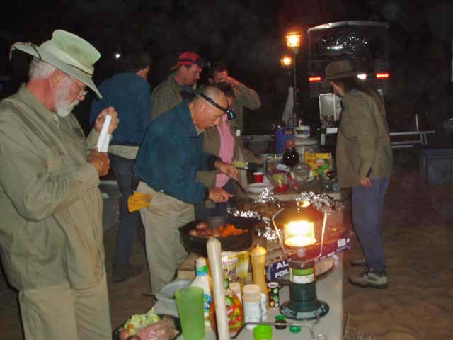 The extrication went off easily with minimal drama except the obvious. And happily, the tires reseated without having to take them off the truck, saving a bunch of sweat and time. All the tire work caused us to get to camp late. Like the last trip, and the trip before that. We looked for a proper site, but there were no really good ones available. Finally, in the waning light of sunset, we settled for "acceptable" rather than perfect, and setup for our dinner of Prime Rib, potatoes, corn and cherry cobbler. Below, Kathleen prepares one of the Dutch ovens and sets up the table service.