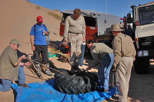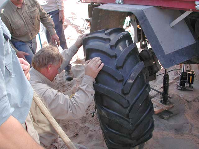 Here, the team attacks the offending tire. Once the tire was off the truck, there was really no problem in getting the tire to seat on the rim. The XM's are good for that and no pyrotechnics were required in stark contrast to last time.