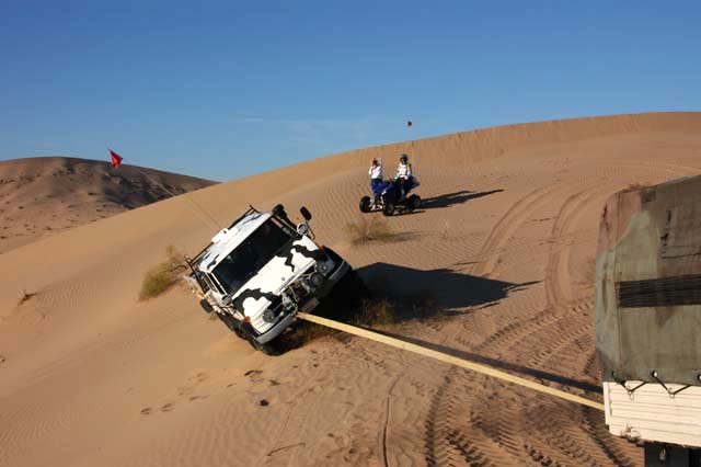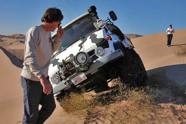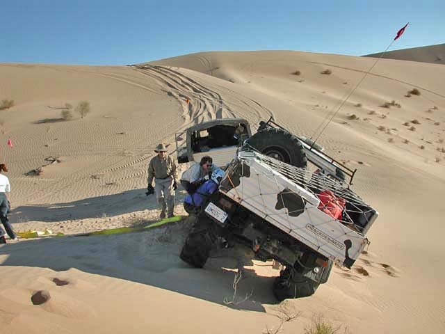 As we worked our way through the dunes, we came to a bowl that we were not sure we could get out of. So, to play it safe, we parked at the rim and checked it out. Dan went into the bowl to check it out. Once we decided it was too soft and that egress was potentially a problem, we were preparing to move on in a different direction. Kai mistakenly backed up at a critical point and started to slip over the edge, resulting in "a situation". It seemed like he was going to roll into the bowl.
