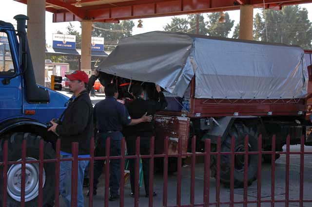 At first light, we got up and packed to leave for the border. Unlike the previous trips, we intended to do the dune crossing on street capable tires. Each of the team had the Michelin XM-47s on their rigs. The 1300s had the 425/75R20s and the 416 had the 405/75R20s. The implication was that there was no need to change tires, making the logistics of the trip substantially easier. After a brief stop at a local McDonalds for a breakfast-like substance, we headed directly to the San Luis, AZ border crossing, south of Yuma on highway 95. Once there, we got in line to be inspected by the Mexican officials. Below, you can see that they took a special interest in Dan's rig due to the fact that it had a covered rear canopy.