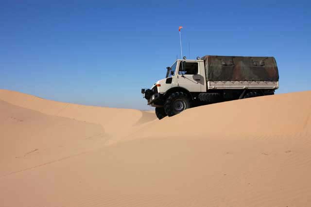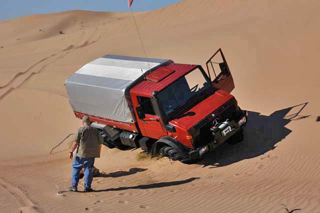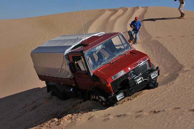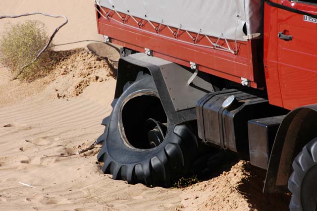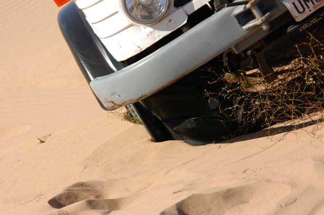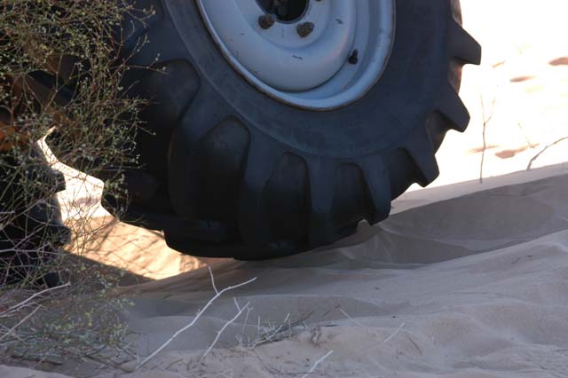 It did not take long before the problems started. Dan was the first stuck. As you can see from the tracks, he side slid down the soft sand and was unable to counter steer. I am guessing that he did not have his differential locks engaged. Diff-locks always help on soft side hills. While they do not insure your ability to cross a side hill, it greatly raises the chance that you will succeed. In this case we decided to tow Dan rather than letting him continue to dig and suffer. Note the depth of the tires in the sand. He plowed a big furrow before he finally got stuck.