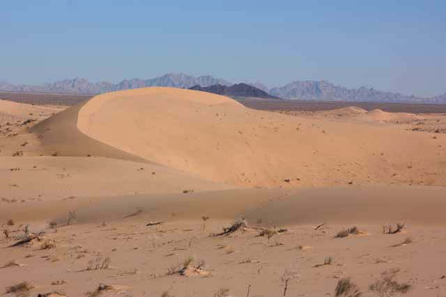 Looking back to the USA, you can see the distant mountains of the Tinajas Altas Range and the closer range of the Sierra El Rosario in Mexico. And of course, in the foreground, is the classic crescent razor back dune structure so prevalent in the Altar desert.