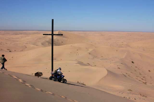 Below, Kathleen is treating us to the sights before donning the gear necessary to safely ride in the high dunes of the Altar.