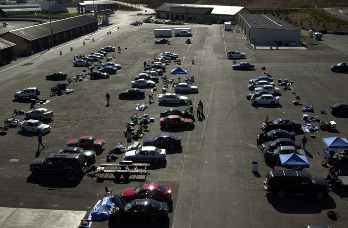 Everybody has to remove all items from the car. Here the parking lot is full of stuff. Stands are in the background .