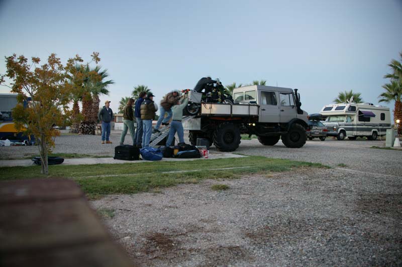 As with the previous trips, the team met at the Sans End RV Park in Winterhaven, CA. We all arrived the night before and had dinner in our favorite Mexican resturant to start the trip in the right way. Next morning, we got up bright and early to make a run for the border. We skipped breakfast and prepared to hit the road. Below, team members help unload Jay's motorcycle from Rob Pickering's 1300 DOKA.
