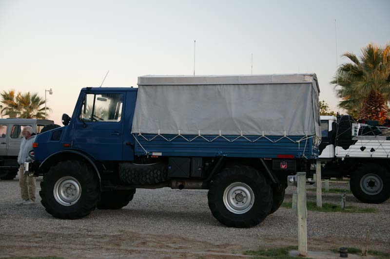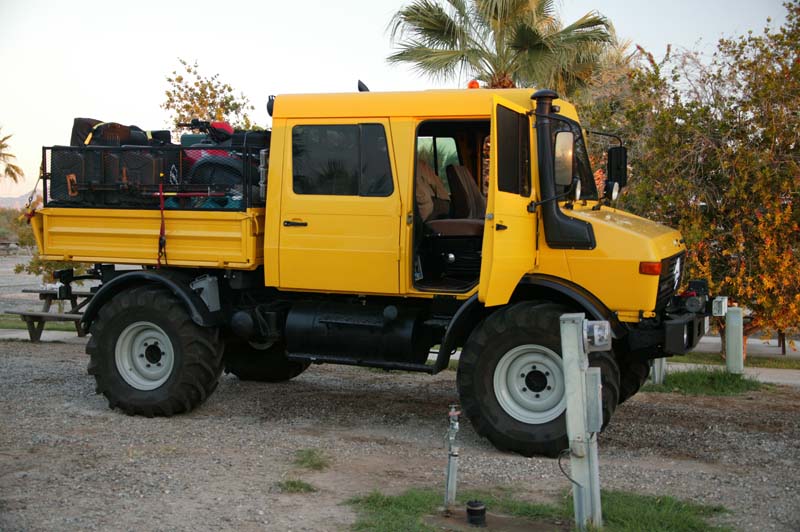I departed Celaya on Saturday midnight, after passing Gauadalajra going toward Puerto Vallarta we got pulled over, we lost the rear license plate, it was not properly bolted, gave explanation to the officer, showed other documents and was let go. We had to stop later to fix the front license. We were doing 89.2 kph steady at 2450 governed rpm´s, on a looooong downgrade we did 134 kph checked by GPS, on neutral, of course, we even went on neutral like for 7-8 minutes on another downgrade going toward the beach. That terrain is very hilly, going up and down 3,000 at a time. Our first tank lasted 740 km, at a good 5 km/l (11.1 mpg). Then we had an air leak, yes, from one of all the plastic tubing lines that we had to replace thanks to my good idea of washing "sparkling clean" the truck with the high pressure water washer. It puncture almost every line. So, one of the line broke loose from the fitting, we stopped and notice that the gear box was steaming from the incoming shaft from the engine. We just stood there. We started stopping people so they could notify the police to send a wrecker, then a patrol arrived with 3 policemen armed with UZI´s, they stayed there until we left 5 hours later, "marihuanero" country they said, you can be assaulted here for sure, so they baby-sited us. The first wrecker arrived, not the right type so then they requested another one, a wheel-lift type. While waiting for the wrecker Elga and Werner from Germany (they were at Calico) stopped with us when they noticed the U-1450, they did not recognize me until I told them about my talibans and Adriana, so that means that instead of being Roberto now I need to reference myself to my children and wife.... to be continued.Well, if I write everything then I will have less to talk about during the trip.... let´s hope my truck makes it here.