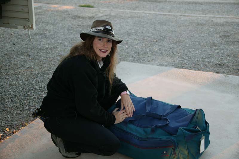 Kathleen puts the finishing touches on packing her bag from the previous night.