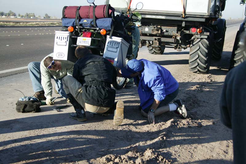 It did not take long before the problems started. Jay's bike had tire problems and we had not even left the blacktop in the US. Below, we assist him in replacing the wheel.