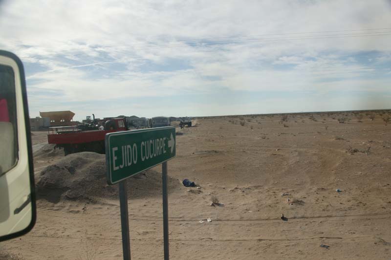Here is the turnoff. This sign is new since last year. We never did find the ejido, I think it is just a sign. The turnoff is just before Cesar's truck stop. Cesar's is about 17 miles east of the border crossing on Highway 2. We turn south and then air down and unload the quads and get dressed for the trail.