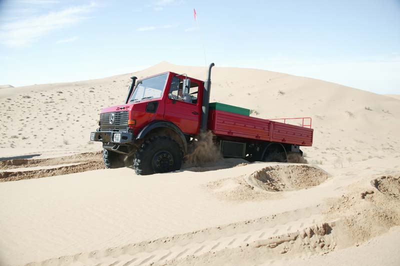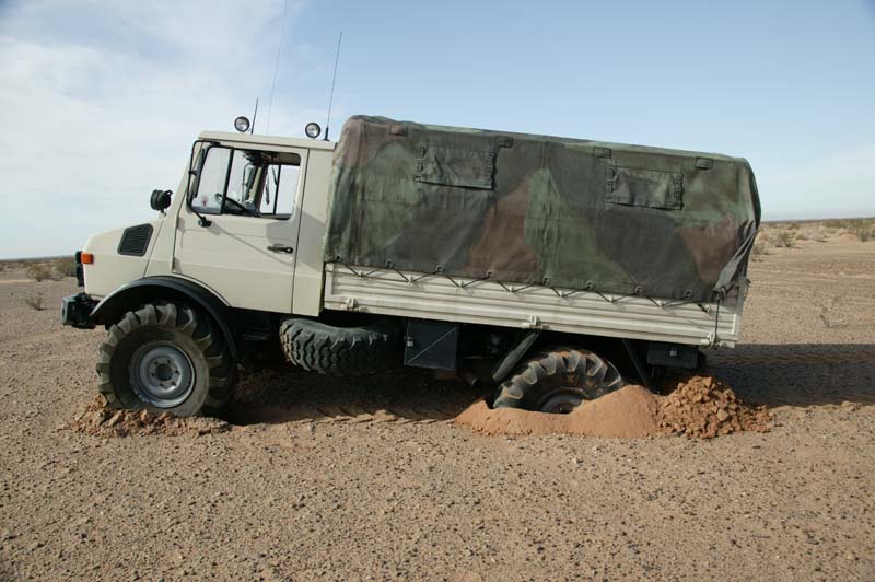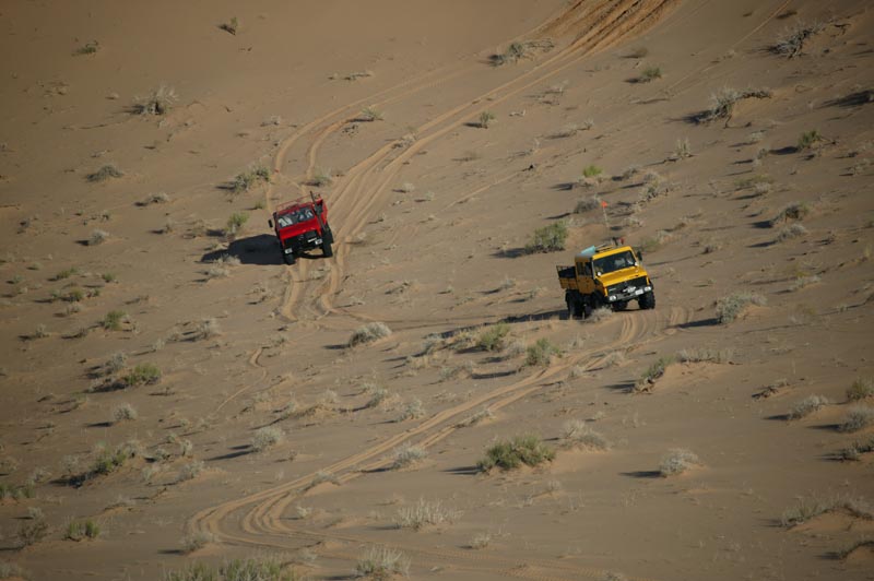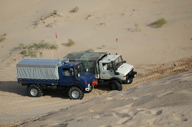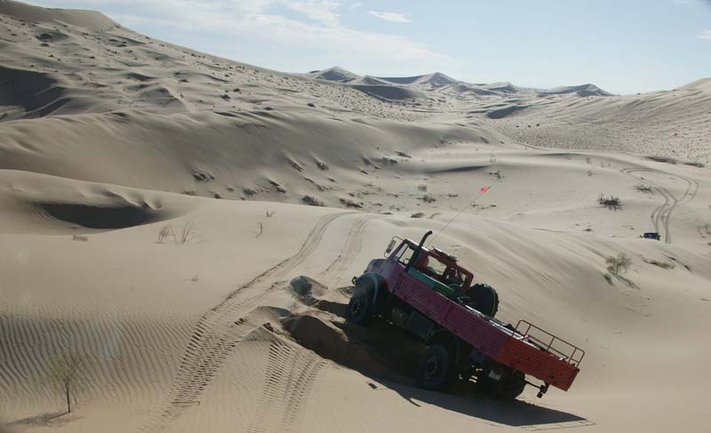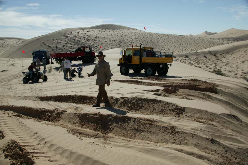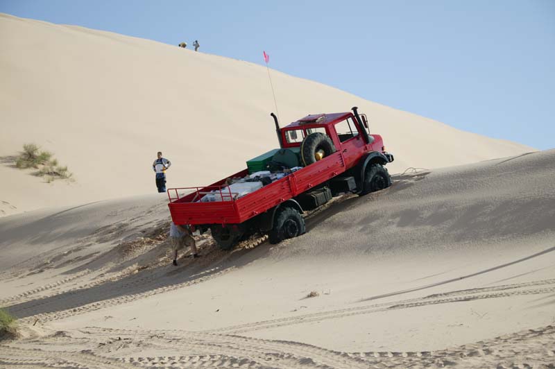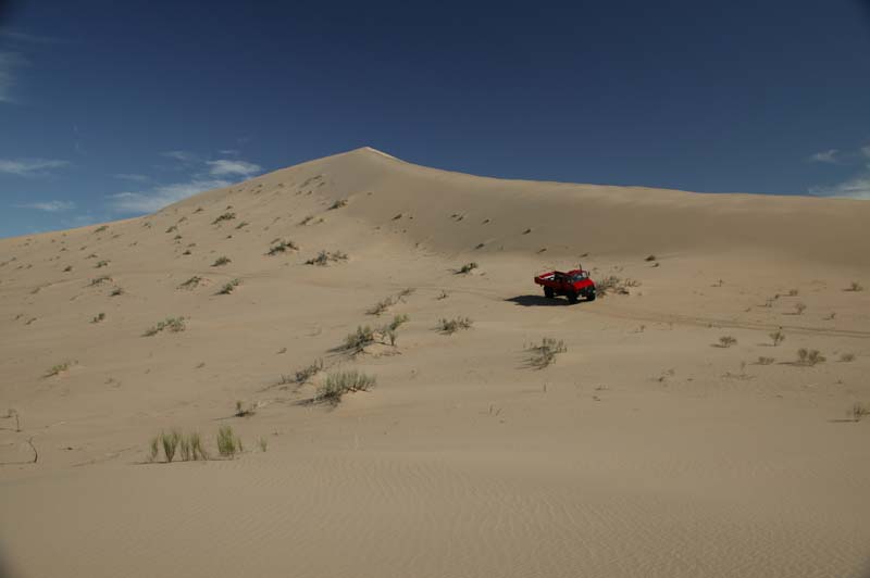 Given the softness of the sand, Dan went ahead to scout out the situation. Below, he returns back to the group. Note the size of the dunes relative to his huge 2450L. We were concerned that we would get into a "death bowl" that we could not get out of. This as it turns out, was a reasonable fear as we did get into trouble.