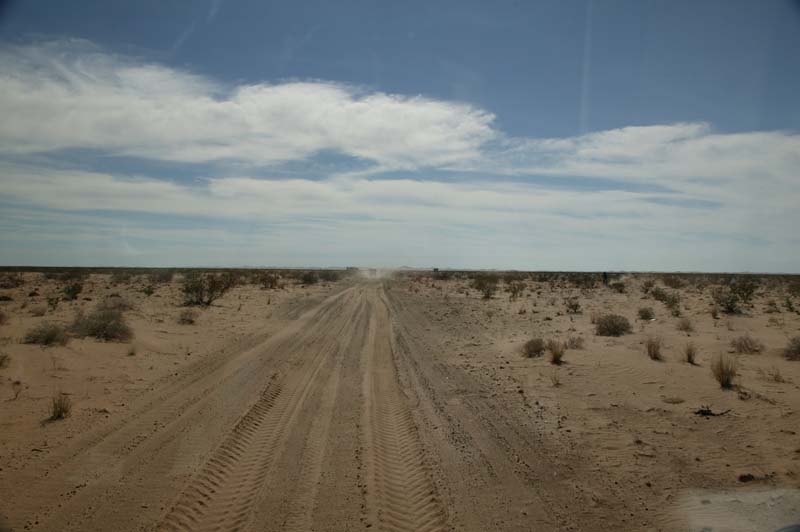 Below is the trail leading south from the air-down point to the dunes. This terrain is flat, featureless and dusty.