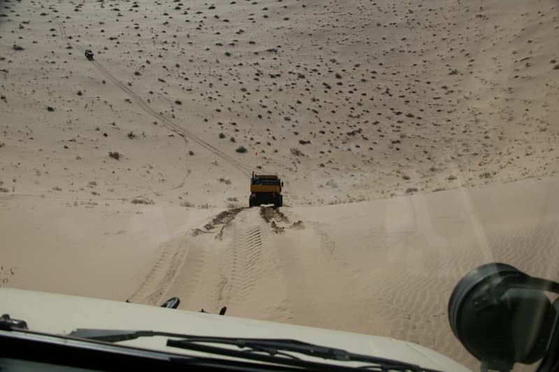 Below, is a shot of one of the many sphincter-tightening downgrades. This was shot through the windshield. Note the size of the truck in the distance to give you a feel for the height of the dune. Turns out that we were driving into a "death bowl" where exit would be very challenging and a return back up this face would be impossible.