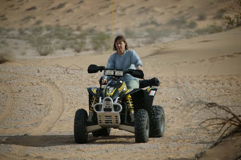 Nancy going for a post breakfast ride on Dan's soon to be wrecked quad.