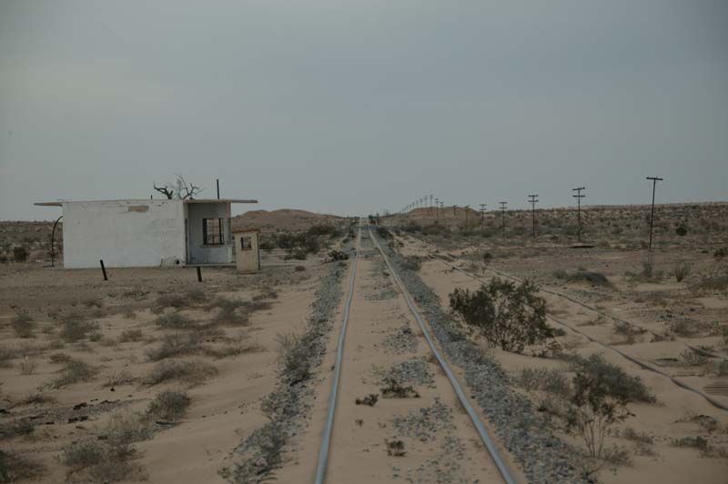 A view of the trans-peninsula railroad and an abandoned facility.