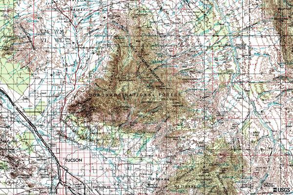 The Santa Catalina Mountains are the dominant feature of the Tucson skyline. Rising over 9500 feet, the mountain is tall enough to influence the local weather. The figures below shows maps of the area and a photo of the south face of a small portion of the Catalina range. These are steep mountains with rugged terrain and big cliffs. The mountain is roughly triangular with one of the flat sides facing Tucson. Oracle is at the north apex of the triangle.