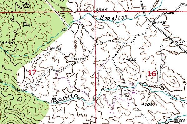 The Madrugada Ranch is the set of blue squares in section 16 to the 10:00 from elevation 4508. Bonito Creek is labeled at lower center of the map.
