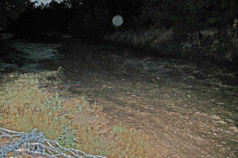 The creek was moving so much debris that it was like a saw. There were fence posts, tree limbs, whole trees, big chunks of concrete pipe and big boulders. As we stood on the bank, the boulders clacked as they were moved down stream by the nearly 200,000 pounds per second of water that was passing us. We watched as big chunks of river bank were sawed away by the fast rushing water, disappearing into the deepening darkness. The noise of the water was substantial. There was a vibration induced by the movement of the sheer mass of water moving past us. Plus, the sloshing of the water and the grinding of the debris in the water.There was so much debris in the water it was like a soup. It was clear that if you fell into the water, you would be crushed by the debris, stabbed on tree branches and the drown in the cold, turbid waters.