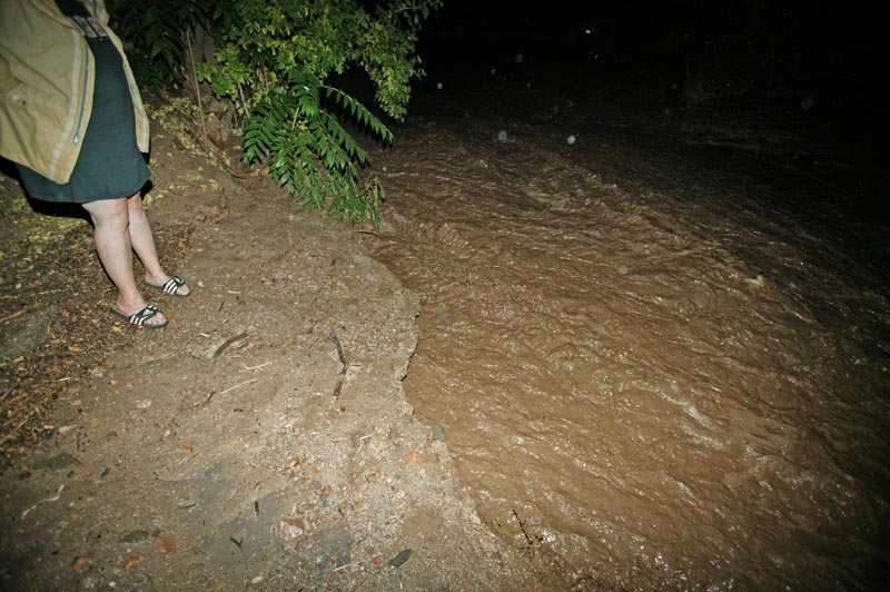 Kathleen, Sandee and I chatted and drank. It was clear that as the rain progressed, Sandee was getting more and more restless. Having suffered the death of her neighbor and substantial damage to her place back in 2003, she was very wary. Meanwhile, we lit the bbq and prepared to cook some chicken. As the chicken was done ,we served up the food. The rain continued to intensify as we ate. Finally, Sandee requested that we help her test the flood alarm. After the events of 2003, she had the alarm company install a water alarm that would notify he when the water in the wash reached a certain level so she and her daughters would have time to evacuate if needed. She left the house and poured water in the sensor. To our collective relief, the alarm sounded as it was supposed to. We returned to eating our chicken and salad. Within another minute after the test, the alarm went off again. I assumed that the system had not been fully reset. We stood to look at the wash out the front window and to our dismay, it was running. Strong. Within seconds, the second stage alert alarm sounded. Something closely akin to panic overtook all of us. I grabbed my camera and ran outside. It was raining pretty hard. I ran to the creek and took the shot below. The waters were surging, strong and cold, the color of chocolate milk. The water was heavy with suspended mud and debris.