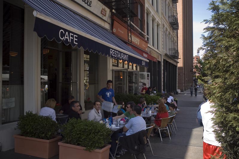 Now that spring is here several things return to Manhattan (besides the smiles of the residents). First is leaves on the trees and the second is the sidewalk cafe culture. This is looking north on West Broadway.