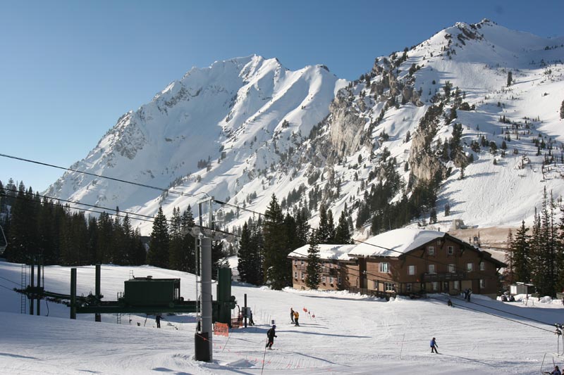 The base area at Alta. View of the south face of Little Cottonwood in the background.
