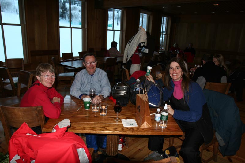 End of the first day at Alta. The conditions were nearly perfect. As we were preparing to leave, Bob got a great idea: leave our skis at the shop at Alta and have them do a tune-up. That way, we would not have to haul them home and they would be in great shape for the next day. Sadly, the shop ground the wrong angle on our edges (all 4 pairs) and the next day were were out of control. While none of us fell, we did return the skis to the shop for some remediation. They did improve a bit, but they were still unstable and chattered terribly. We skied the rest of the day, but had to take them to another shop for more work to un-do the "repairs" done by the other shop. They did give us our $100 back. But, the money was a small consolation. The funky skis pretty much ruined an otherwise great day. As a saving grace, we did have a great lunch at the Collins Grill at mid-mountain.