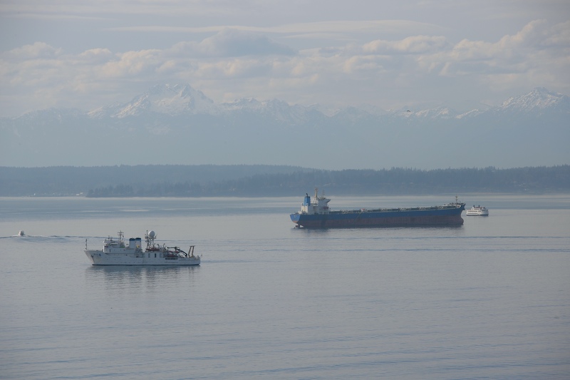 NOAA research ship in the foreground with grain ship and the Bainbridge Ferry. Olympic Mountains in the background.