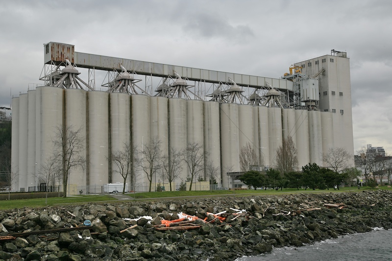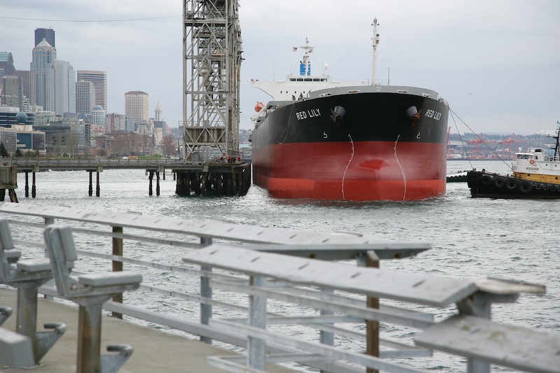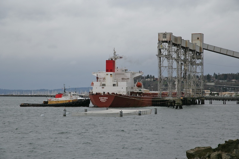We live right next to Elliot Bay in Seattle. The location affords us a great view of the comings and goings of grain ships that take on cargo at the Seattle Grain Port just north of our apartment. One overcast morning (which is most mornings) I saw the tugs approaching the docks. This could only mean one thing -- a changing of the guard at the loading dock. So, I grabbed my 1Ds camera and bike and peddled north. The wind was strong and cold making it less that pleasant outside. The photos below are what I saw.