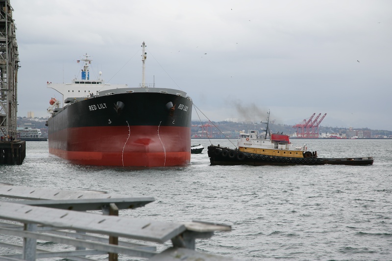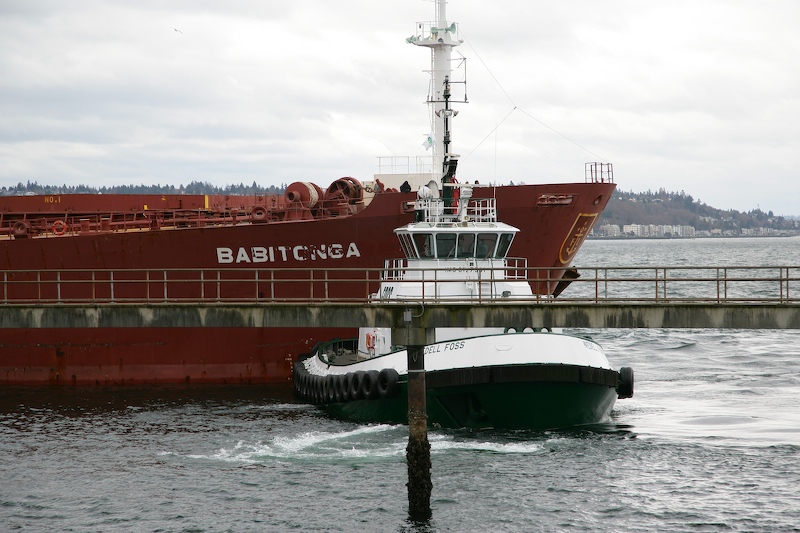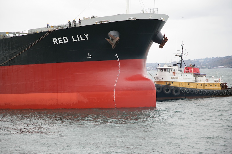 Done with the Babitonga, tug "Weddel Foss" prepares to assist Red Lily into position at the dock.